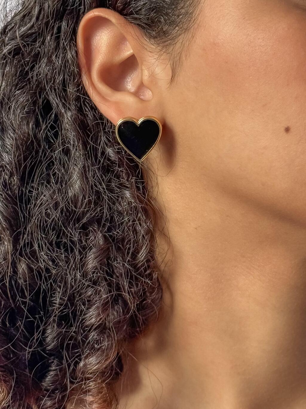 Brinco Coração Preto Dourado: um acessório que combina elegância e charme, perfeito para realçar qualquer visual.